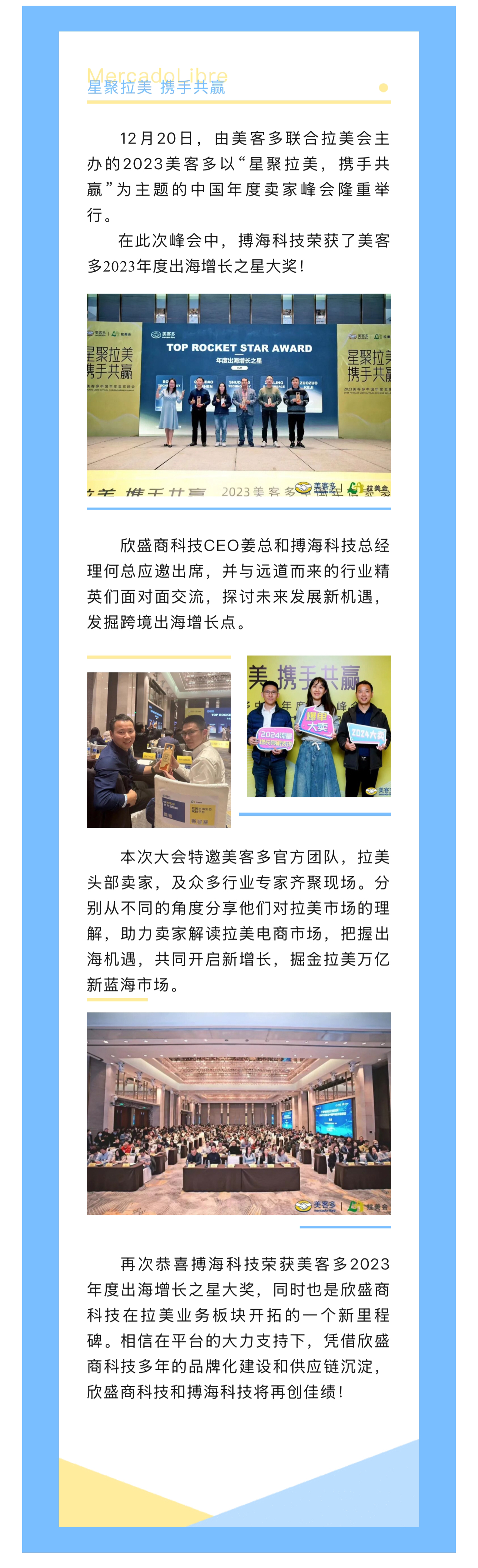 喜报!欣盛商科技子公司搏海科技荣获美客多年度出海增长之星